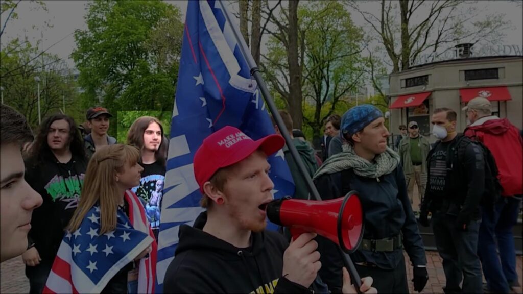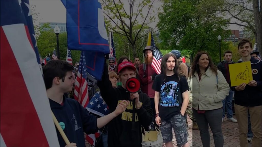 On May 13th, Hayden attended Boston Free Speech’s first rally at the Parkman Bandstand in Boston MA, alongside one of his bandmates from Acid Raīn Forest. Rightwing musician Don Dunst a/k/a “Duerst the Wuerst” later uploaded video from the rally and the following march, which included Hayden heckling counter-protesters with a slur against trans people and joining in on a chant of “let the [chicken] tendies hit the floor.” [Speculative: …Is that his mom in the second photo, to his direct left?] [1]