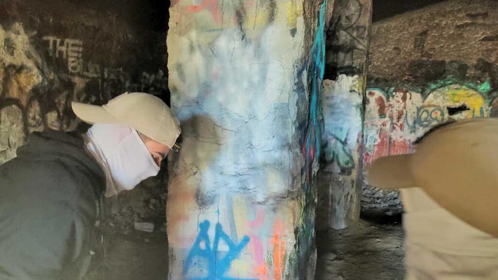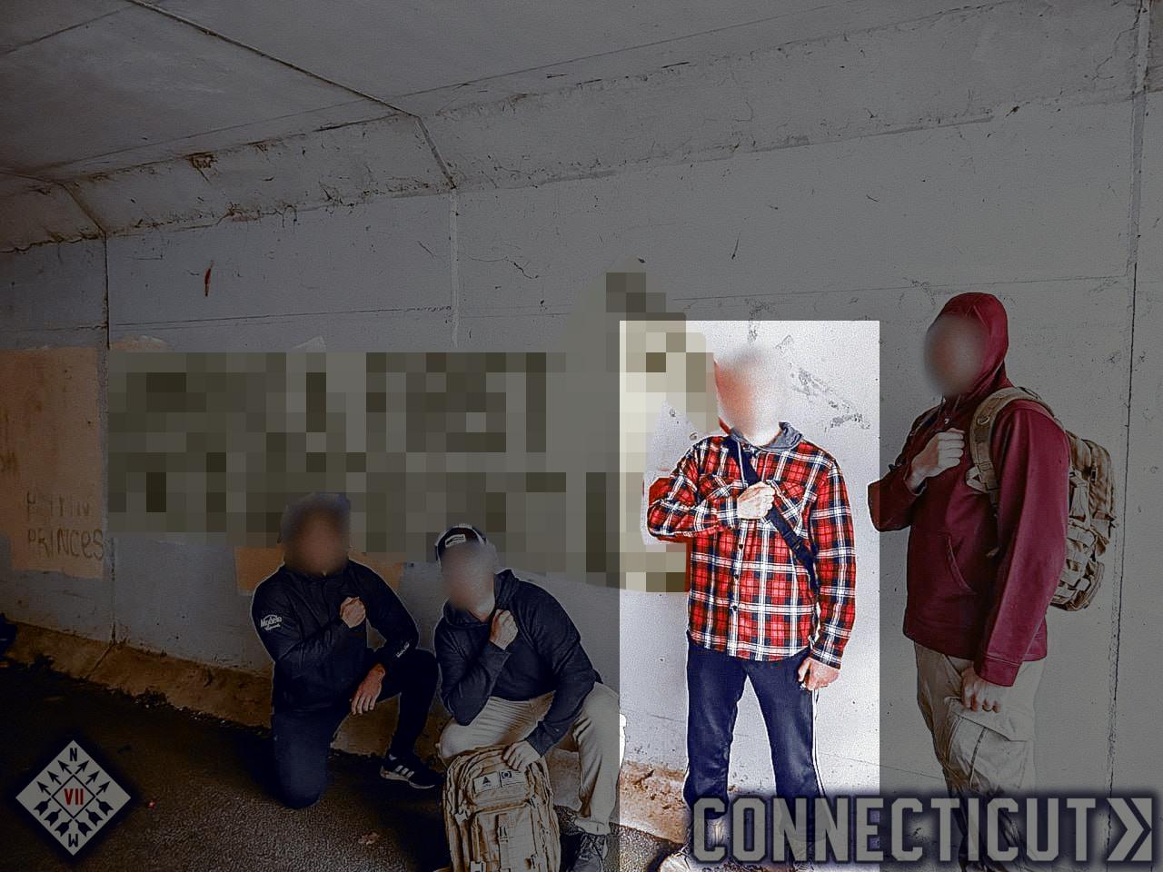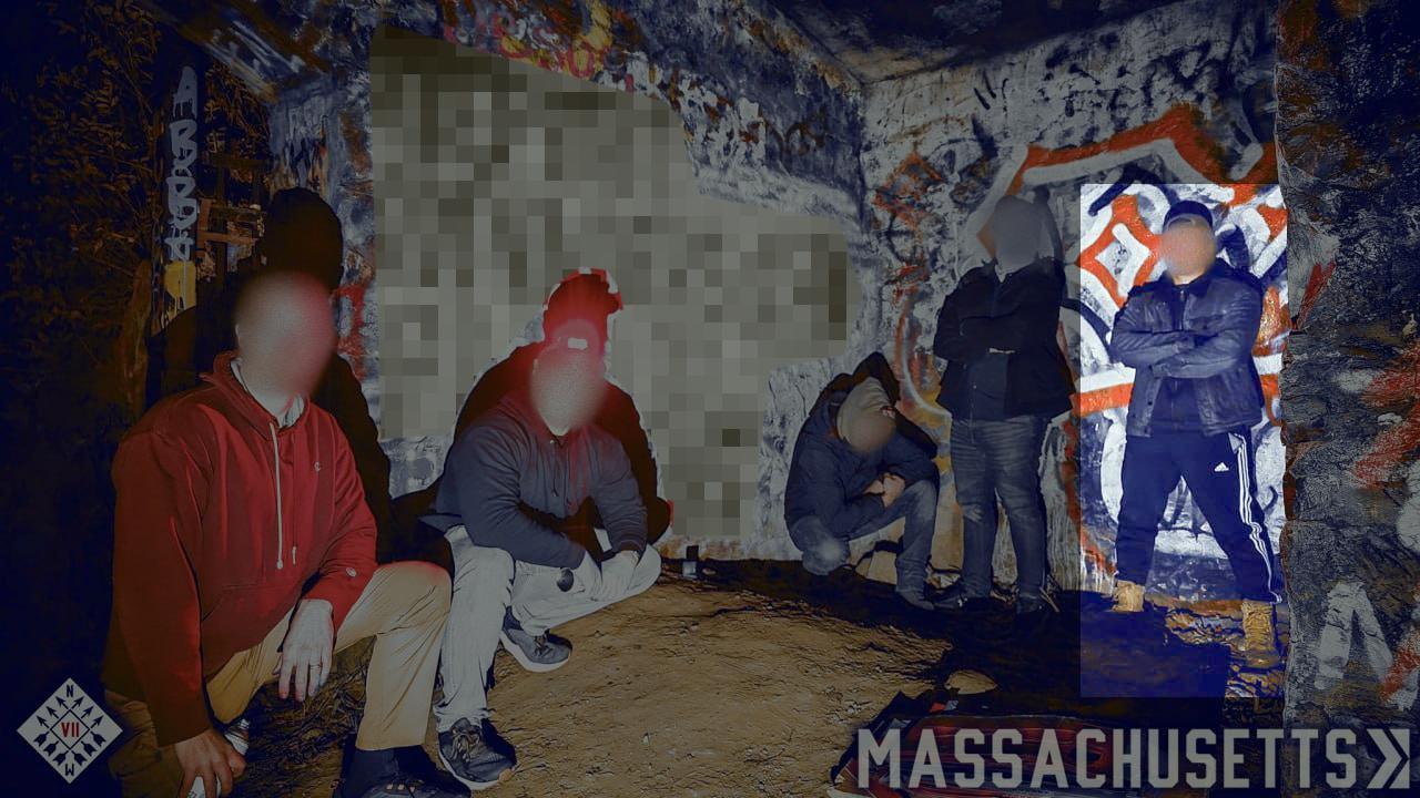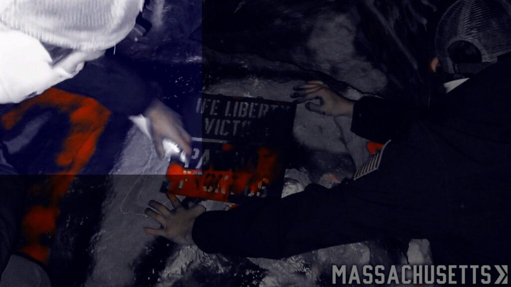 On October 23rd through the 24th, Hayden, Harwood, Beilman, Smaller, Sal Munafo a/k/a “Phillip MA,” Wyatt Trahan a/k/a “Josh NH,” Nick Cerce a/k/a “Mike RI,” and another member of Patriot Front planned to camp out and spar at Purgatory Chasm in Sutton MA. Hayden was recorded spending much of the hike in boxing gloves, in a baffling choice of hiking gear. [µ] Once on site, he sparred with Smaller and Beilman. [µ] Members stayed the night in Purgatory Chasm. At some point, Sutton PD encountered cars belonging to Hayden and Harwood parked outside the campground. A detective with Sutton PD would later relay this information to detectives investigating Matt Smaller’s stickerings at FSU during 2022. [♣] The second day also saw distribution of propaganda, with the members splitting into two groups. Hayden was slated to join Harwood, Munafo, and Trahan in a plan to spray graffiti at the Clinton Train Tunnel and banner-drop in Worcester (which instead appears to have materialized as postering), while the other group was to travel to Newton (planned in error, as the location was actually Waltham) and Rutland. [µ] Hayden and Munafo instead appear to have joined members Alex Beilman and Nick Cerce in graffiti activities planned in Rutland MA. [µ] Material from this event was not posted onto Patriot Front’s Telegram channel until December 19th, mixed with photos of another graffiti event in Quincy MA during October of this year, in six separate posts. The Telegram release suggests that the day’s plan may have been revised sometime after the planning document was published. [Speculative: This specific release also indicates that Hayden likely switched from the Clinton-Worcester group to the Waltham-Rutland group, probably to join his brother alongside Beilman, Smaller, and Cerce.] [∗]