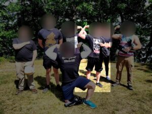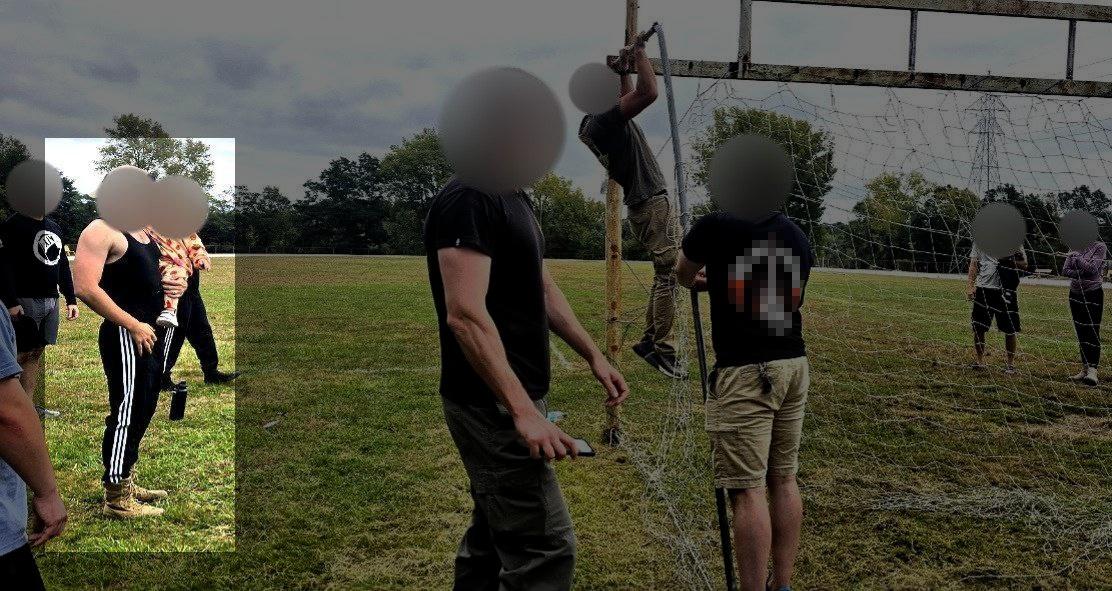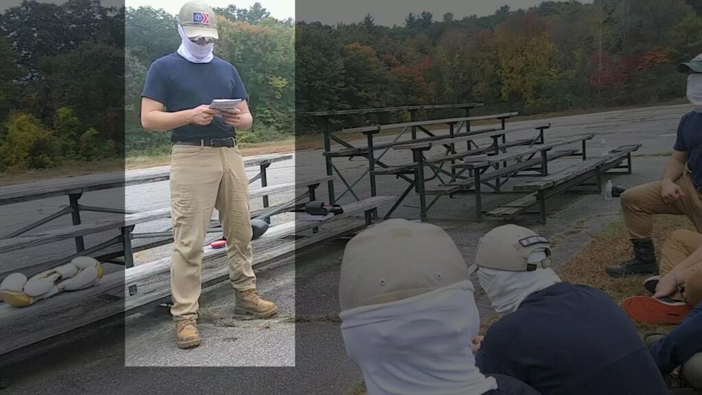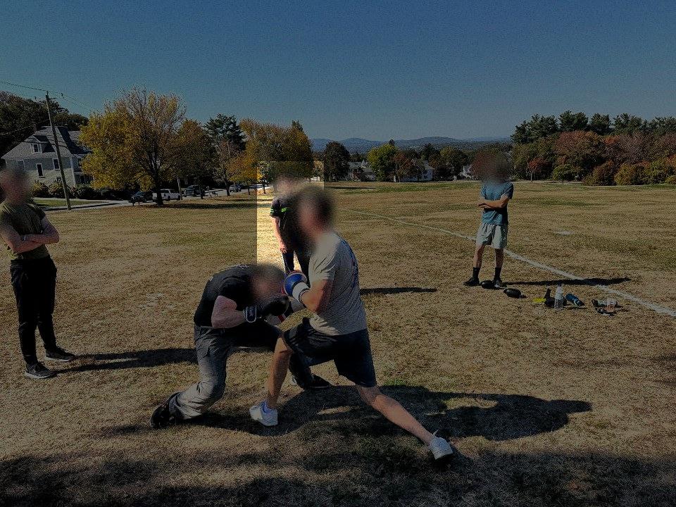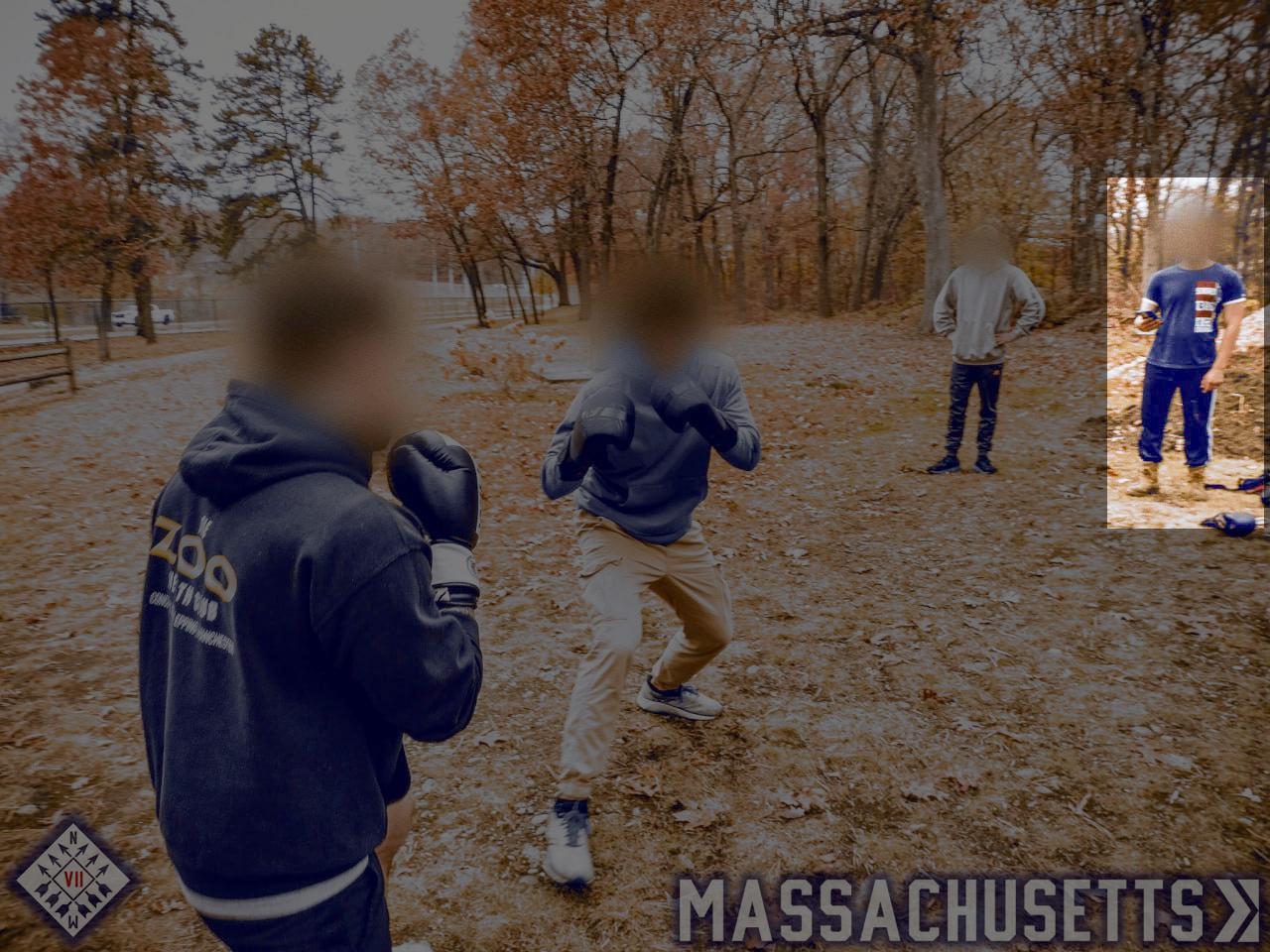 On October 17th, Hayden and several other members of Patriot Front met at Draper Fields in Hopedale MA to train and spar. A number of leaked videos include Hayden, with videos of him jogging, attempting to spar with Alex Beilman a/k/a “Tyler CT,” sparring with Brian Harwood a/k/a “Henry MA,” and another of him giving a reading. [µ] [1] On this same day, the “Active Club XIV” Telegram channel cross-posted from the first iteration of the “Bay State Active Club” channel for the last time. The cross-post appears to include a photo from the Patriot Front sparring session in Hopedale MA. At some point after this, BSAC’s Telegram channel was deactivated, and not re-registered until 2023. [∗] Material from this event was not posted onto Patriot Front’s Telegram channel until November 27th. [∗]