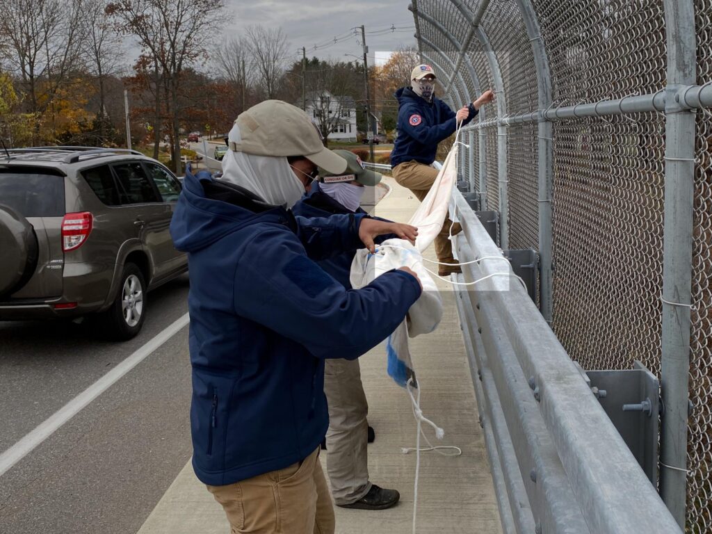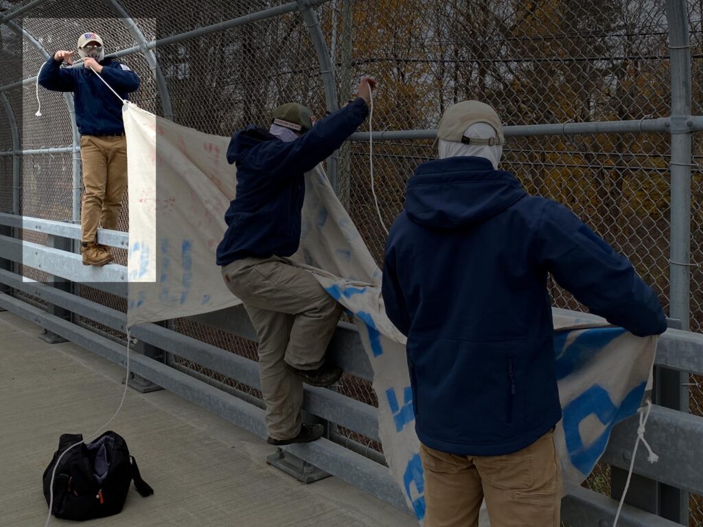 On November 21st, Hayden, Harwood, Beilman, and Trahan engaged in various promat activities in Dover NH and Greenland NH, including banner-drops. [1] [2] [3] Leaked materials indicate that Hayden likely participated in a graffiti spray-painting at a Dover NH underpass, and banner-drops in Greenland & Dover NH. [µ] [µ] [µ] Hayden also took responsibility for a stickering in York ME with Nathanial Whitfield, a/k/a “Joshua UT,” at the time acting Network Scribe for NW5. [4] [5] Beilman later claimed in Patriot Front internal channels that the members of NW7 present in New Hampshire, including Hayden, were stopped by a police officer during one of the banner-drops. [6] Material from these events were not posted onto Patriot Front’s Telegram channel until December 31st, in three separate posts. [∗]