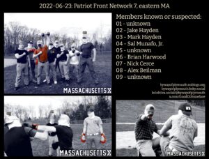 While Patriot Front Network 7 has held a large number of events in Massachusetts that more likely involved Hayden than not, attempts will be made to only include events where proof exists Hayden may have been present, whether by his own admission or through plausible identifications of him through Patriot Front’s own propaganda materials.