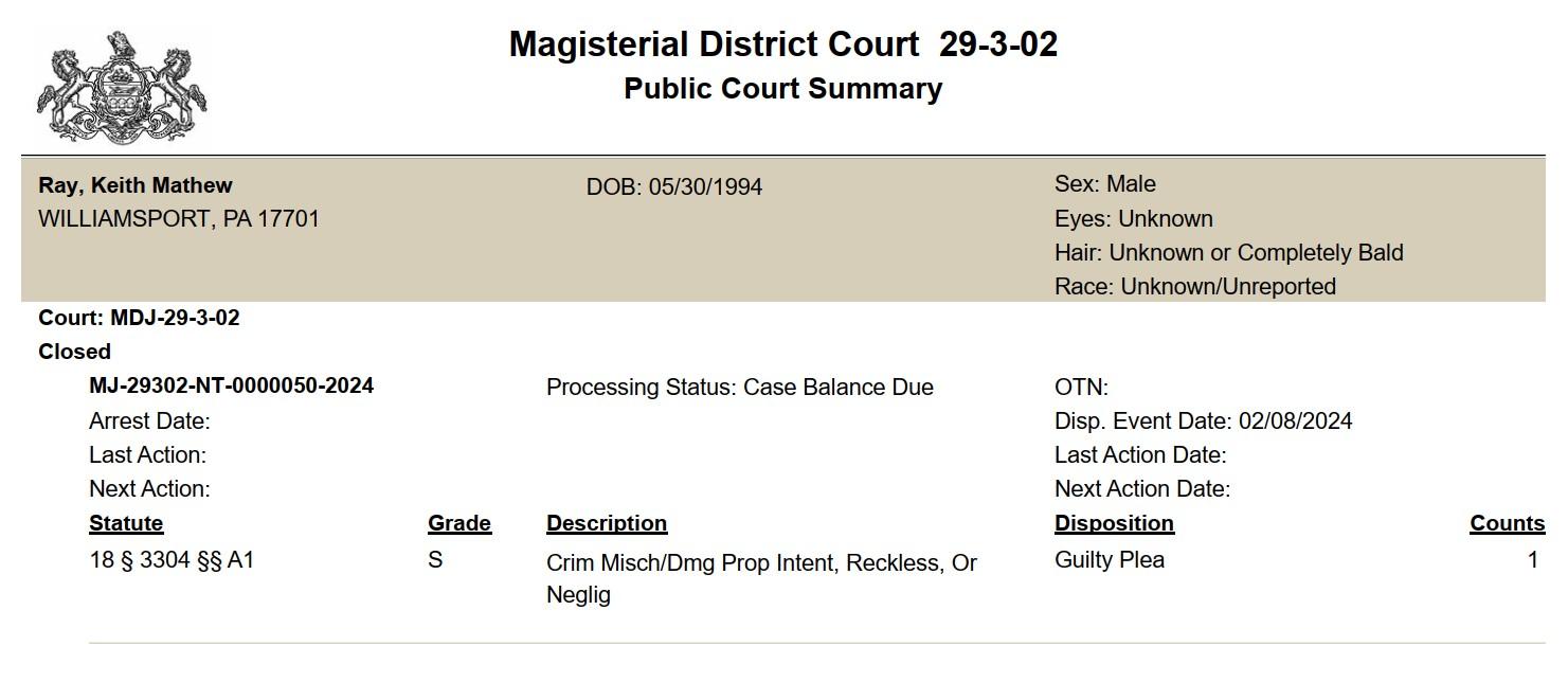 Ray seems to have been pinched by Montoursville PD for criminal mischief late January, a charge to which he pled guilty. Mountoursville is less than 10min from Williamsport by car. It’s kinda looking like he got caught putting up Patriot Front’s slaptags!
