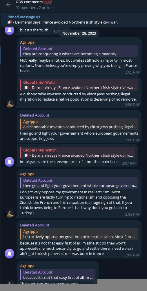 • Various chats connected to Global Intel Watch, which self-describes as “Semi-professional News Aggregation from a Christian realist perspective.” The channel doesn’t seem outright antisemitic in its commentary on Israel, or outright racist in its commentary on the Middle East, but a bunch of the guys in the comments sure are.