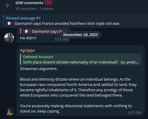 — Behling on the neo-fascist, neo-Nazi, Atomwaffen-linked American Futurist blog, he doesn’t appear to speak on his racism against black folks in most public Telegram chats, but here he’s pretty clear, February 22nd, 2024 [∗]