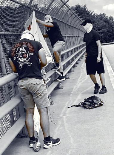 On October 14th, the Patriot Front Telegram channel released photos of NW7 members dropping a banner from an overpass in Bow NH. Behling appears to be one of the members participating. [∗]