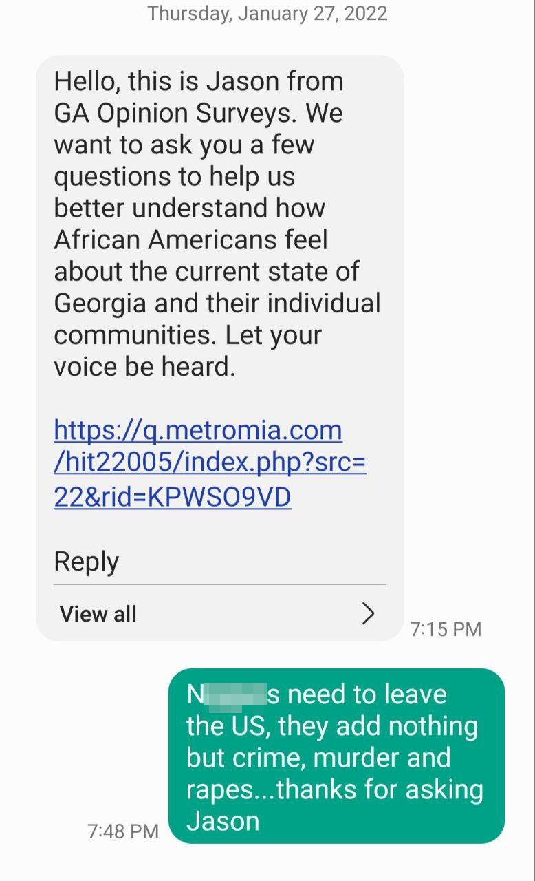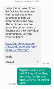 On January 26th, Garcia posted a screenshot, of a conversation he inflicted upon a survey text campaigner via his new cellphone number, to the NE Nats chat. [⊗]