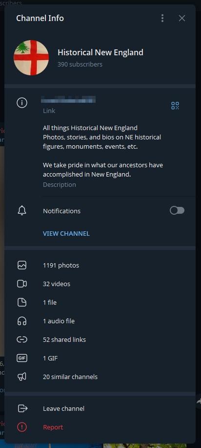 On November 27th, Garcia created his “Historical New England” channel on Telegram. The channel itself was a broadcast platform for Garcia to share photos and anecdotes concerning New England during various historical periods, occasionally featuring editorializing from Garcia itself, while gradually becoming more visibly racist and pro-Trump. The channel also had a connected discussion chat where Garcia would engage with subscribers, which was obviously neo-Nazi in context. [⊗]