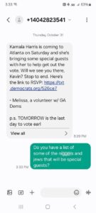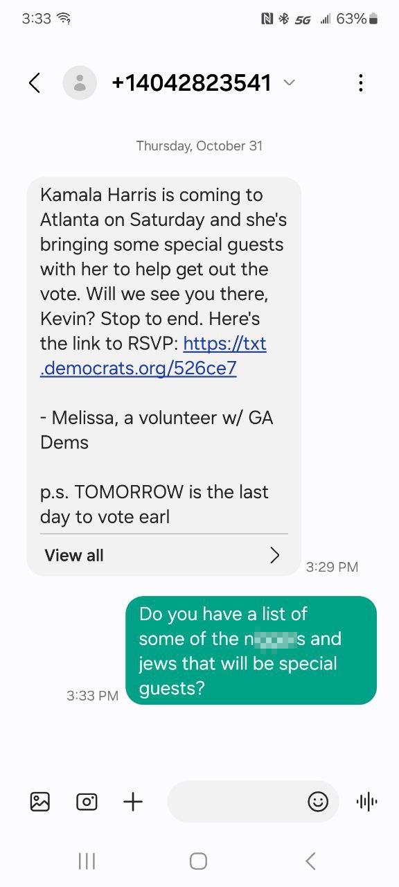 On October 31st, Garcia received a text from a campaigner for Kamala Harris. He subsequently shared his reply with the Historical New England chat, advocating for bullying election texts. [⊗]