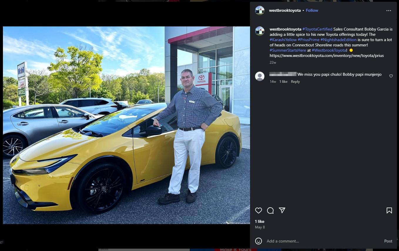 Bobby Garcia, formerly a real estate agent, was employed at Westbrook Toyota in Westbrook CT as of May of this year. He is present on their website’s staff page, suggesting he’s currently employed there.