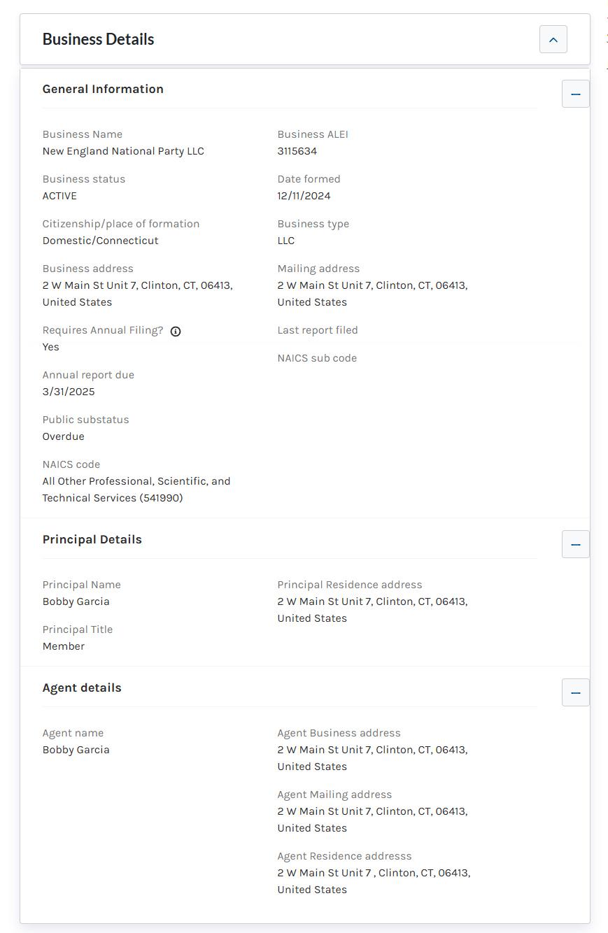 On December 11th, Garcia registered a “New England National Party” LLC with the Connecticut Secretary of State. This seems to have been done in lieu of what the CT Secretary of State has outlined as the first step for creating a “Minor Party” in CT, that first step being winning 1% of the vote in a race for office after filing a Nominating Petition. [1] [2]