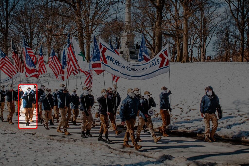 On February 22nd, separate groups of Patriot Front members engaged in a series of marches throughout the United States. This included a trio of leap-frogging marches through New England conducted by the same group of roughly 20 members over the course of the day, starting in Manchester NH, continuing in Boston MA, and then concluding in Providence MA. Rosati was possibly present. [∗]