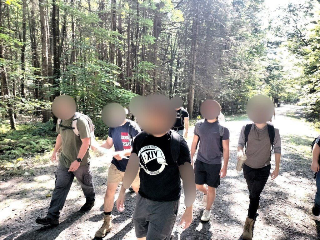 On September 15th, the Bay State Active Club released photos of members hiking Mount Wachusett, in the company of the Walkill Valley Active Club. Rosati, accompanied by a woman who appears to be his wife, was present. the Patriot Front Telegram channel later released their own versions of these photos during November. One of these included a photo of Rosati with his tattoos edited out, the skin of his arms made to look unmarked. [∗]