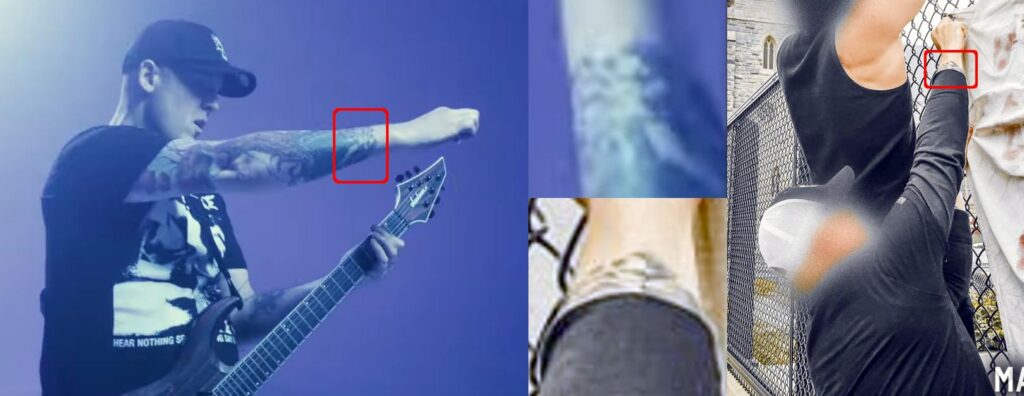 Chris Rosati is a guitarist in a Boston hardcore band called “Death Ray Vision”. They have a pair of music videos out. Released during June 2023, their music video for From the Rafters is 2:35 long. At 2:22, you can see the external edge of Rosati’s right forearm in this video frame: